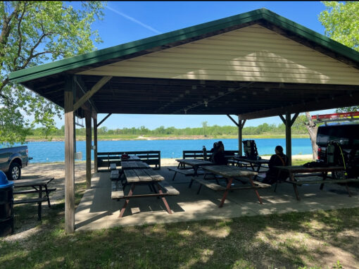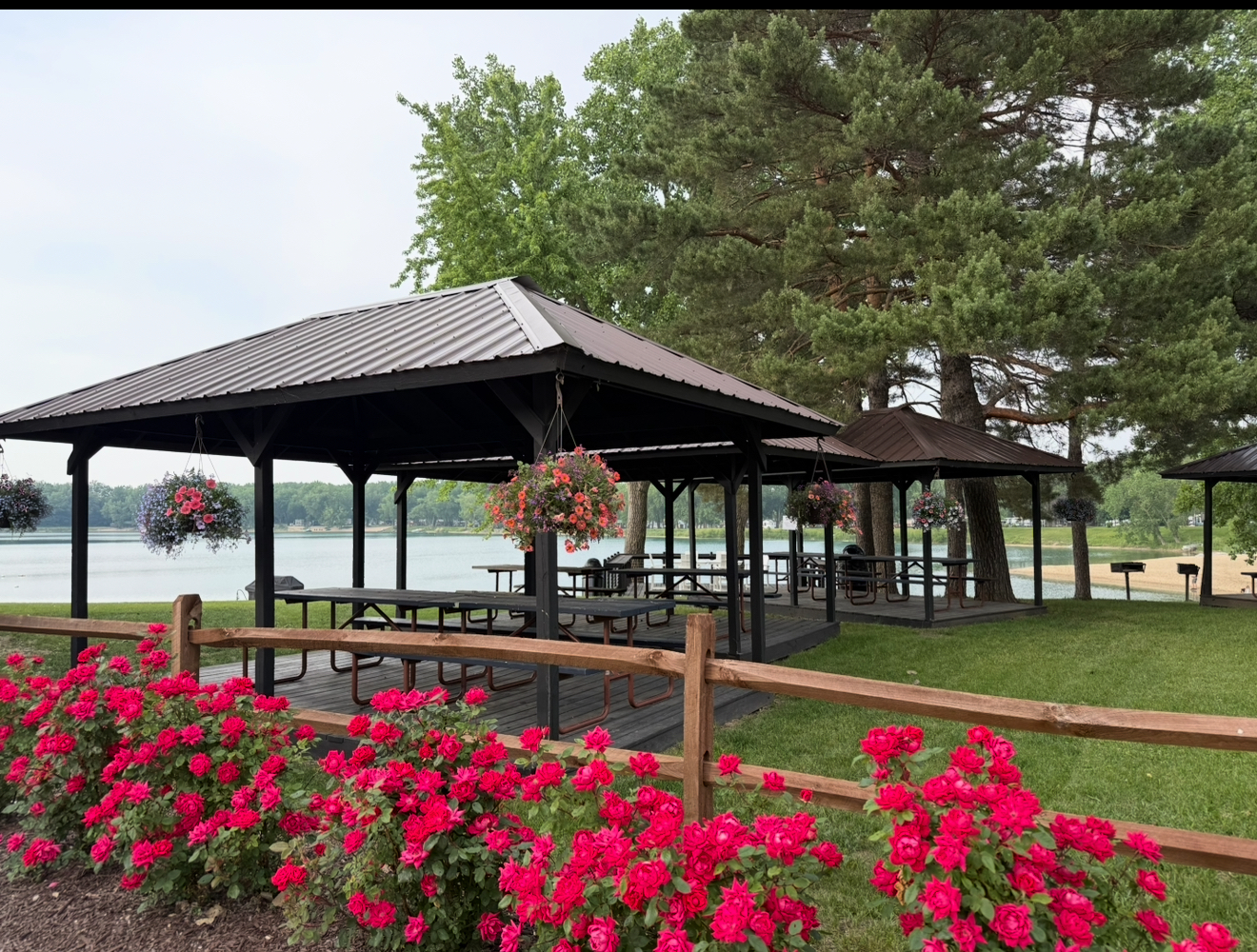 - Several large picnic pavilions near entry points with benches for tanks and gear.