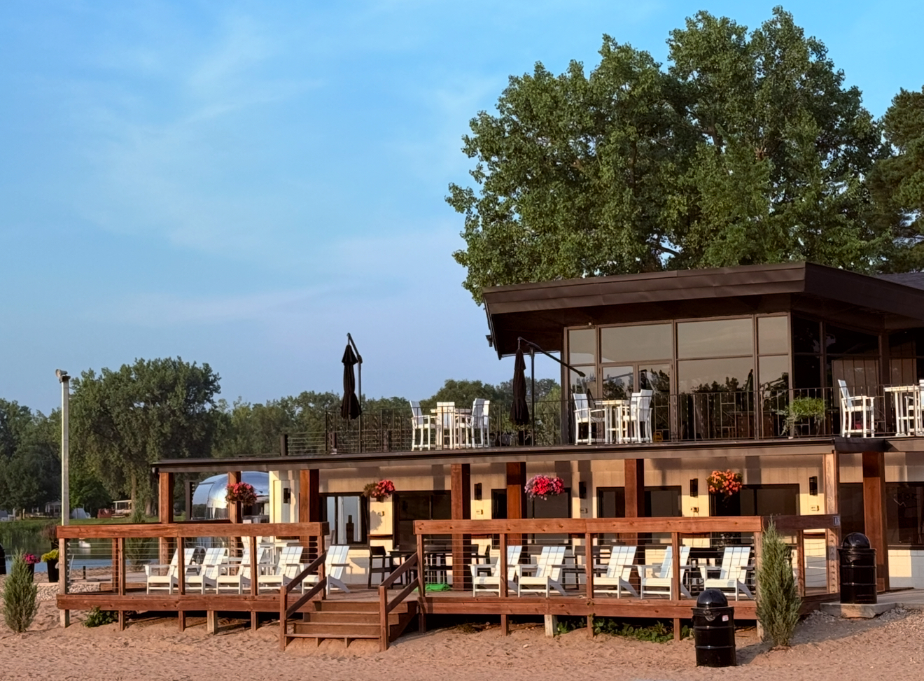 - Lower beach deck with seating and shade.