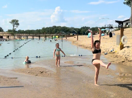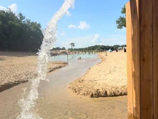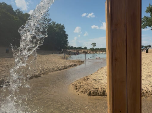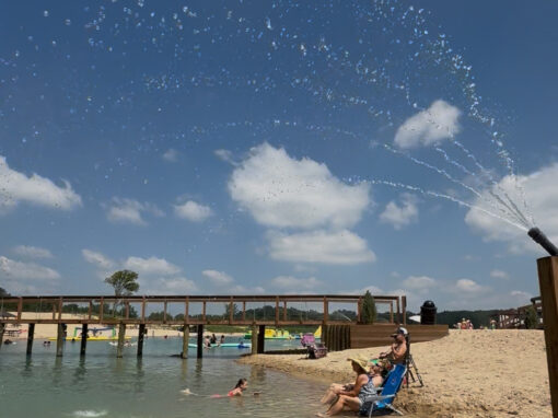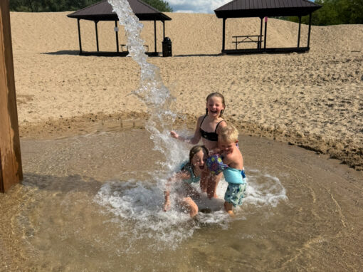 Enjoy our awesome new beach sprinklers that bring incredible ambiance with the peaceful sound of the water sprinklers. At the end our beach we have a large sprinkler that creates a shallow river for natural splash pad fun.